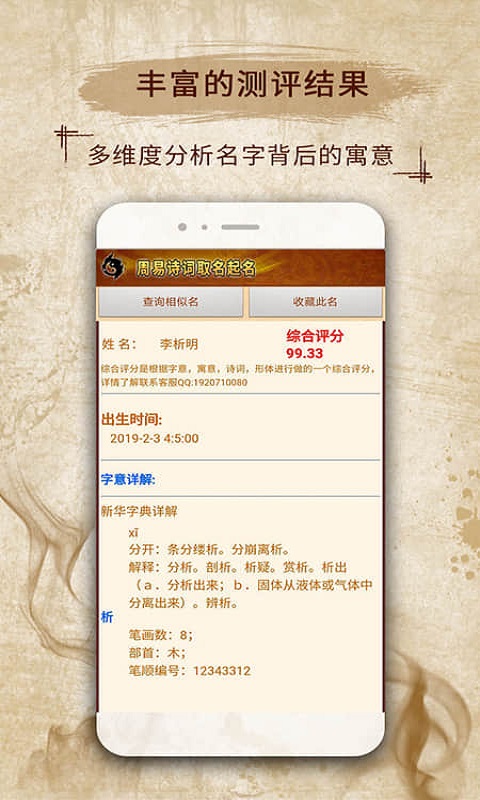 | 周易生辰八字取名起名是一款不用联网宝宝取名软件,它根据周易理论,应用五行、八字、五格三才,剖象,灵动等因素为您宝宝取名起,同时它也是支持诗词取名的宝宝取名软件。 五行指水、火、木、金、土。五行学说认为,五行是构成宇宙的基本物质元素,宇宙间各种物质都可以按照这五种基本物质的属性来归类,五行之间存在着一定的联系。五行一共有两种,一是生辰八字里的五行,是父母带来的,天生不可改,另外一种五行是名字的五行,是后天可增加的,我们可以通过后天的五行补救,真正做到五行平衡。 周易生辰八字取名软件的强大之处,在于它可瞬间生成几万个好名字供您挑选。系统生成的名字从各种古籍、诗词、成语、名人名言、名人用字提取; 并根据取名规则针对五行,数理,生肖评分.周易生辰八字取名软件用户提供了强大取名功能。 |